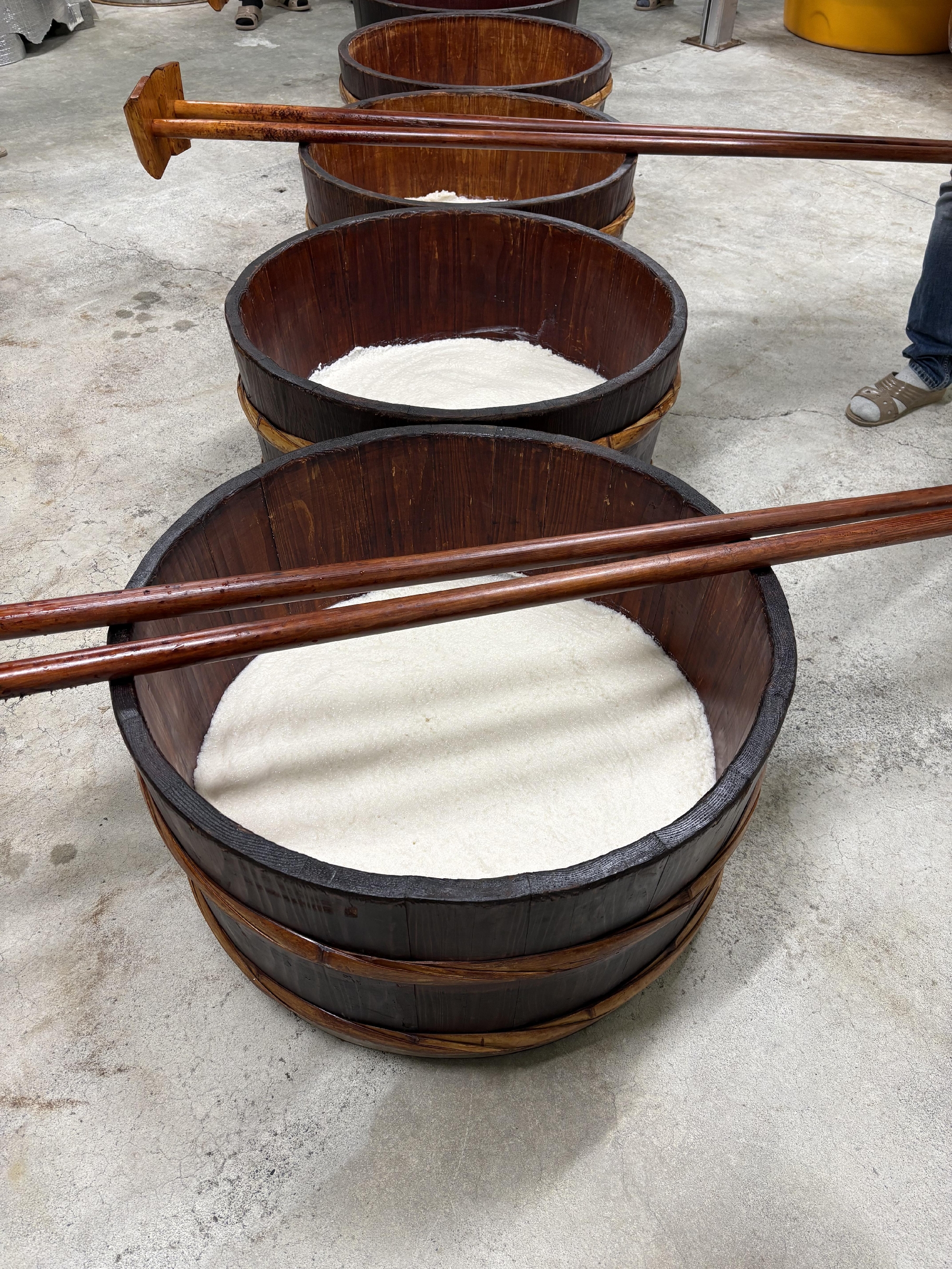 蒸米、麹、仕込み水を『半切り』と呼ばれる木桶に入れて、
