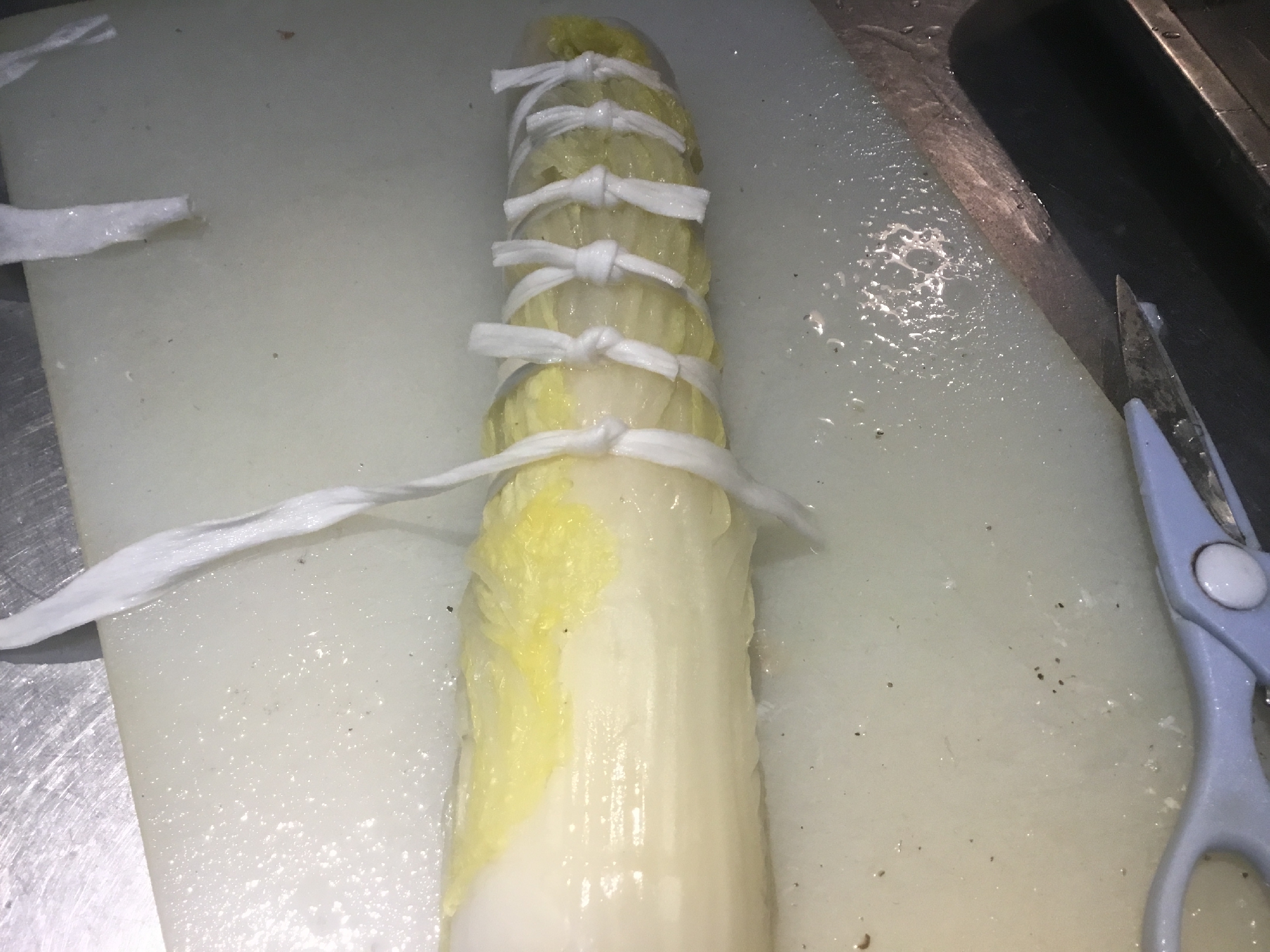 天然きくらげを刻んで、白菜で巻き、干瓢で結びます。
