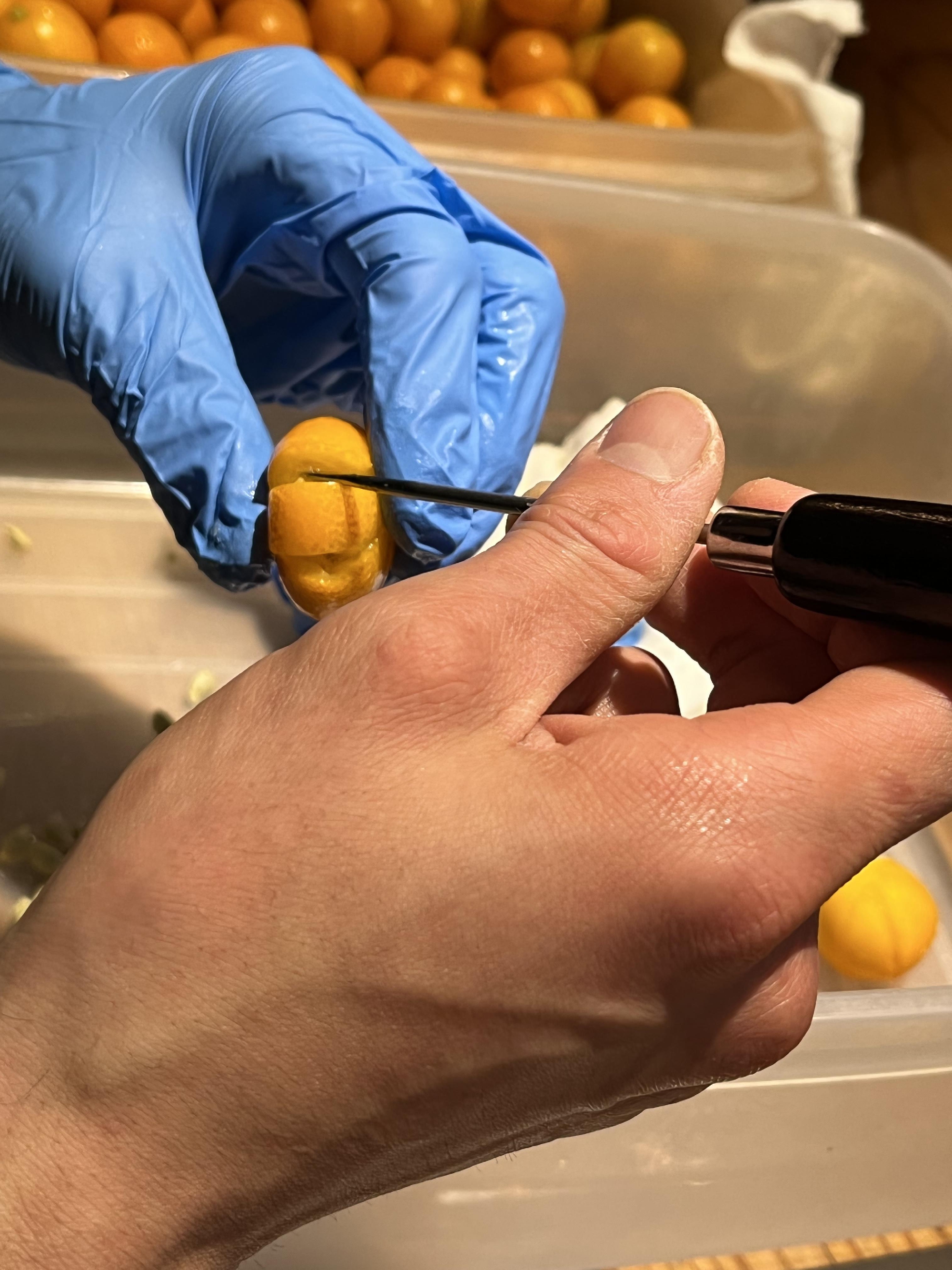 千枚通しを使って、金柑の中からタネを取り除いていきます。