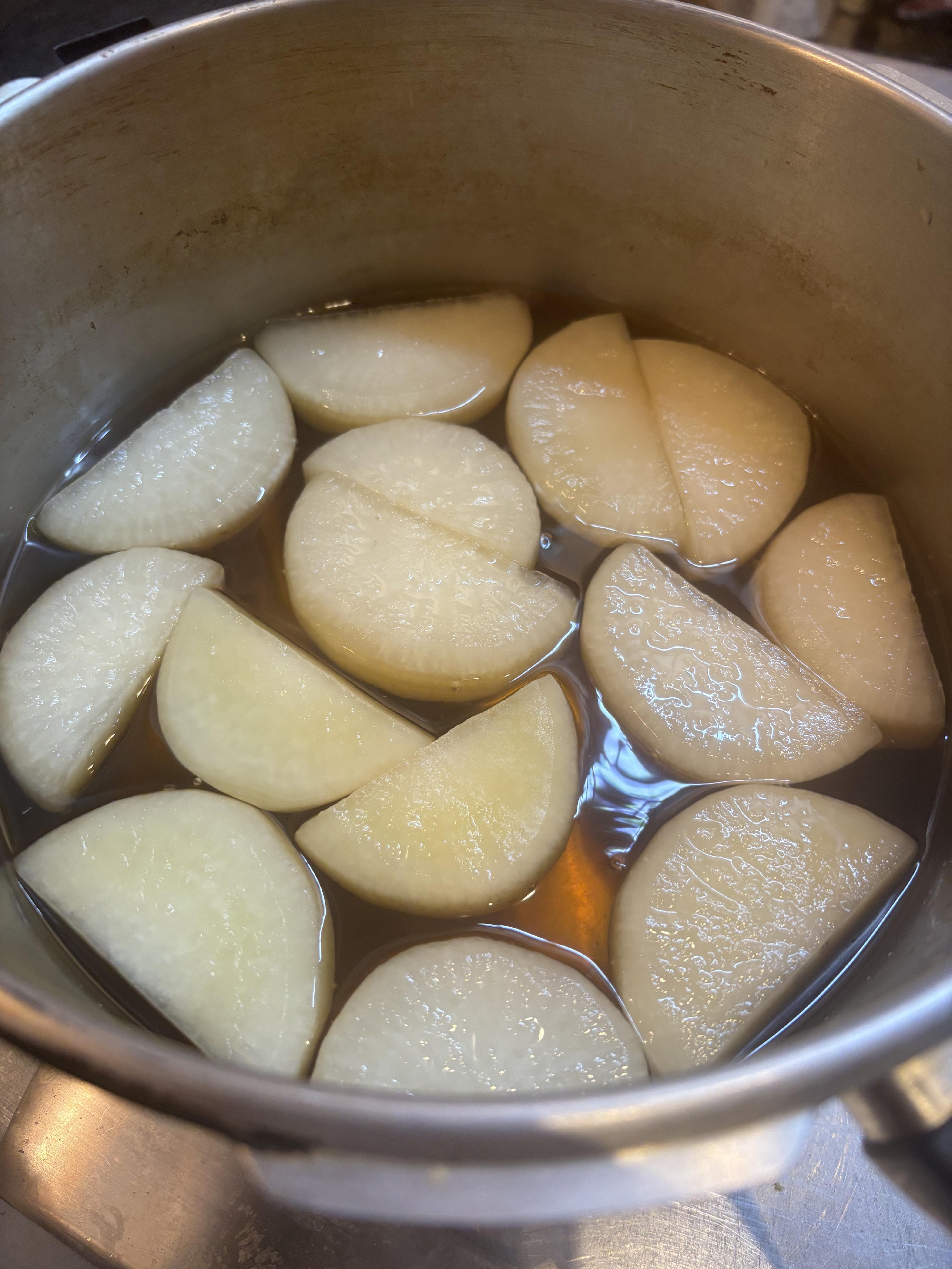 さらに下煮した大根を入れて、さらに炊いたく料理